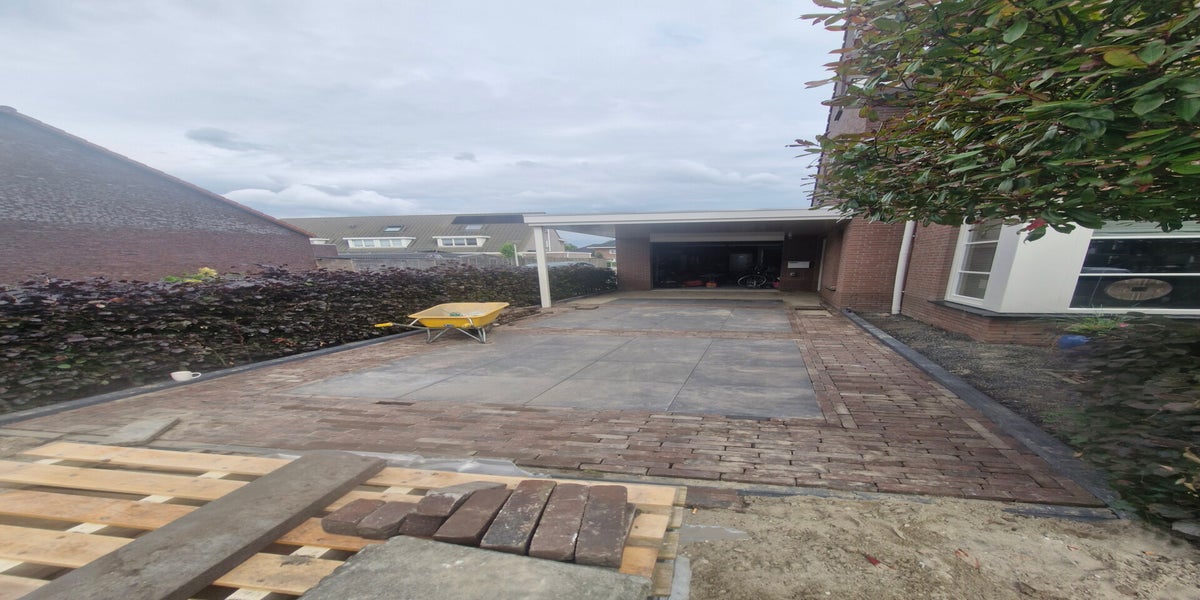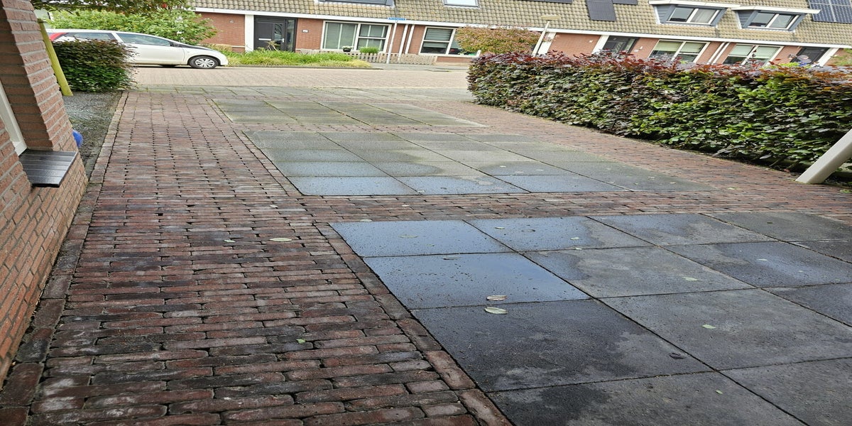Deze oprit hebben we weer een frisse look gegeven. We hebben de gebakken waaltjes hergebruikt en mooie, nieuwe tegels gelegd. Ook hebben we gezorgd voor een betere opsluiting langs de randen. Deze hebben we iets boven het straatwerk gezet, wat een chique look creëert. Bij deze oprit hebben we een roltrilplaat gebruikt. Het voordeel van deze trilplaat is dat je over de waaltjes, maar ook over de tegels kan trillen. Hierdoor blijft alles netjes gelijk en klop je alles recht aan.